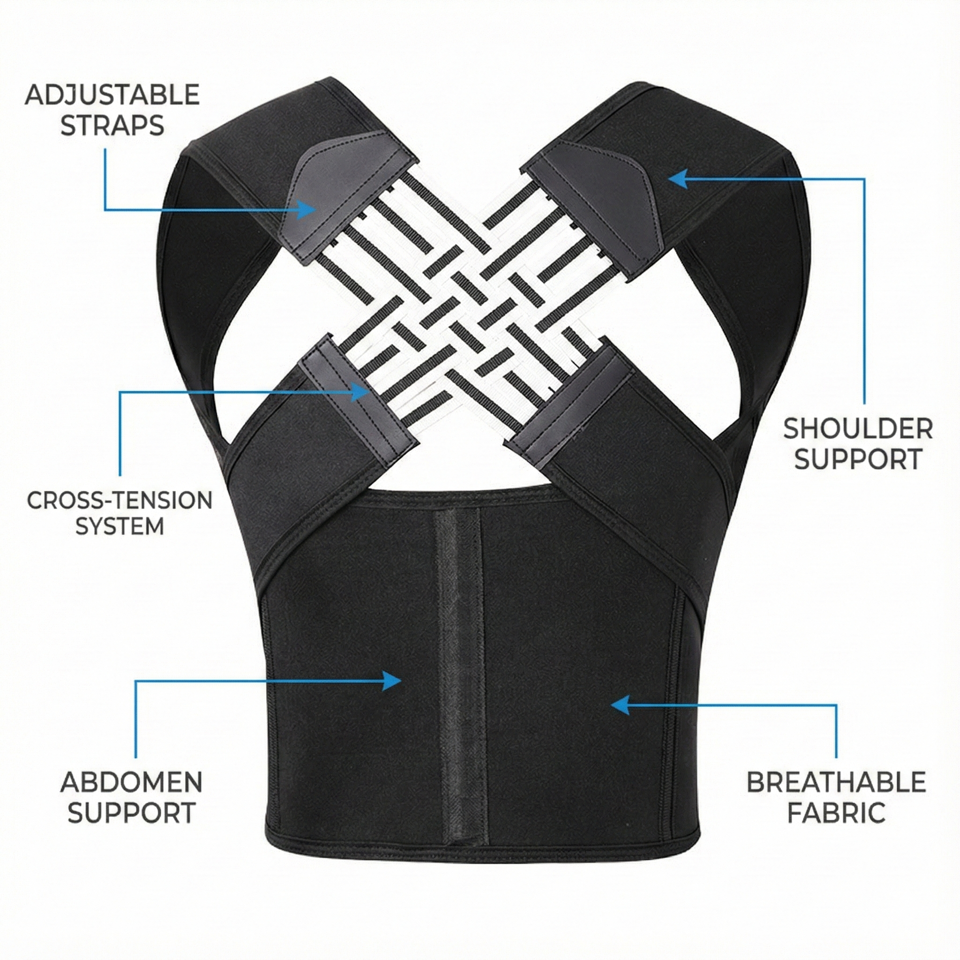 Our posture corrector uses a physio-designed X-Frame system that gently pulls your shoulders back, lifts your chest, and guides your spine into its natural alignment — without forcing or restricting movement.
